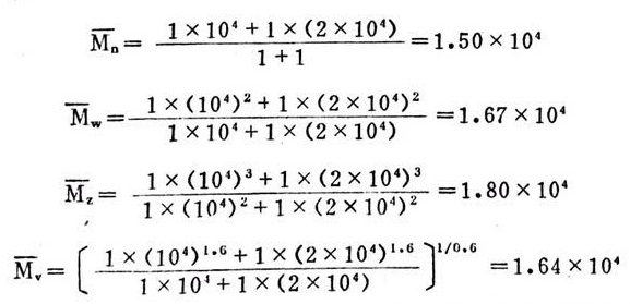 由上述定義可見,各個分子的分子量對用不同方法所測平均分子量所作的貢獻是不同。分子量大的分子對M和M的貢獻大,而對M的貢獻又比對M的大。例如將分子量為0的高分子和分子量為2×104的高分子,各以1克分子相混時,混合物的各種平均分子量分別為:
