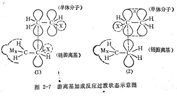 但通常聚合反應(yīng)所生成鏈的連接方式是首一尾加成的結(jié)構(gòu)。這是因?yàn)樵阪溤鲩L(zhǎng)反應(yīng)中,以圖2-7中(1)的方式進(jìn)行加成反應(yīng)時(shí)空間位阻較小,比較容易進(jìn)行。而以(2)的方式加成時(shí),則因位阻較大,比較難于進(jìn)行。此外,由(1)方式生成的游離基,其獨(dú)對(duì)電子能與同一碳上的X取代基
