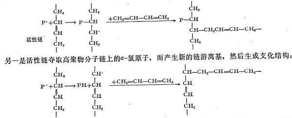 第一章中已提到,在聚合過程中,由于活性鏈向大分子轉(zhuǎn)移的結(jié)果,使高聚物分子鏈支化,產(chǎn)生側(cè)鏈。對于二烯類高聚物來說,由于已生成的高聚物分子主鏈上都含有不飽和的雙鍵,所以鏈轉(zhuǎn)移的途徑有二。一是活性鏈加成于雙鍵,而產(chǎn)生新的游離基,新的鏈游離基可以繼續(xù)支化:
