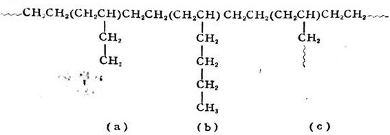 聚乙烯具有規(guī)整的線型結(jié)構(gòu),易于結(jié)晶,但聚乙烯只有部分結(jié)晶,這是由于聚乙烯具有支鏈的緣故。普通的支化聚乙烯在分子鏈上大約每50個碳原子有一個乙基結(jié)構(gòu)式中(a)或丁基結(jié)構(gòu)式中(b)的側(cè)基,這些側(cè)基破壞了規(guī)整性,減少了結(jié)晶度,使聚乙烯密度較低熔點(diǎn)較低。這些分子偶而也含有較長的支鏈結(jié)構(gòu)式中(e),在恒定分子量情況下,它稍微降低了聚乙烯的粘度。