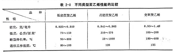 我們?nèi)粘J褂玫牡兔芏染垡蚁┫涤坞x基聚合的高聚物,它因分子鏈上有支鏈,斂集不緊密,結(jié)晶度較低,熔點(diǎn)也較低,比較柔軟,適于制造食品袋、奶瓶等柔軟制品。而用離子型聚合方法制得的高密度聚乙烯,由于分子鏈?zhǔn)蔷€型規(guī)整排列的,所以結(jié)晶度高,強(qiáng)度、剛性、熔點(diǎn)都高,可以制造硬性制品,如水桶、工程塑料等。此外,也還有通過化學(xué)方法或輻射法使聚乙烯進(jìn)行交聯(lián)的,得到交聯(lián)聚乙烯,這是網(wǎng)狀分子結(jié)構(gòu)的聚乙烯,其耐熱性能和強(qiáng)度都較高。表2-8是這幾種聚乙烯某些性能的比較。