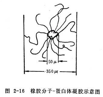 不僅在合成橡膠中,在天然橡膠中也含有一定數(shù)量的凝膠。在天然橡膠及合成橡膠中所發(fā)現(xiàn)的凝膠,按其結(jié)構(gòu)形狀也有許多不同的類型。除交聯(lián)結(jié)構(gòu)的凝膠外,在天然橡膠中還存在著較低分子量的橡膠分子,它們被化學(xué)吸附在變性蛋白體(由各種氨基酸組成)的表面而形成約為100~1000nm大?。ㄖ械葻崃烟亢诹W拥拇笮。┑哪z(圖2-16)。